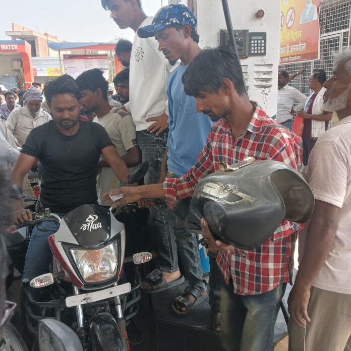 हाथ में मोटरसाइकिल की टंकी लेकर पेट्रोल लेने पहुंचा युवक:डुमरियागंज में 3 दिन से लाइन में लग रहा था, लंबी कतारों से बचने के लिए अपनाया तरीका