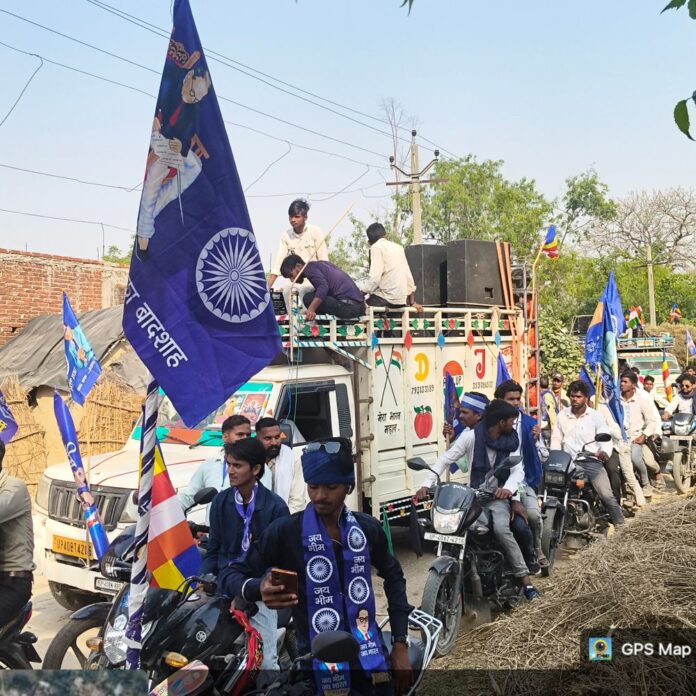 वेलहन महेशपुर में अंबेडकर जयंती मनाई:डॉ. भीमराव अंबेडकर की 136वीं जयंती पर निकाली गई शोभायात्रा