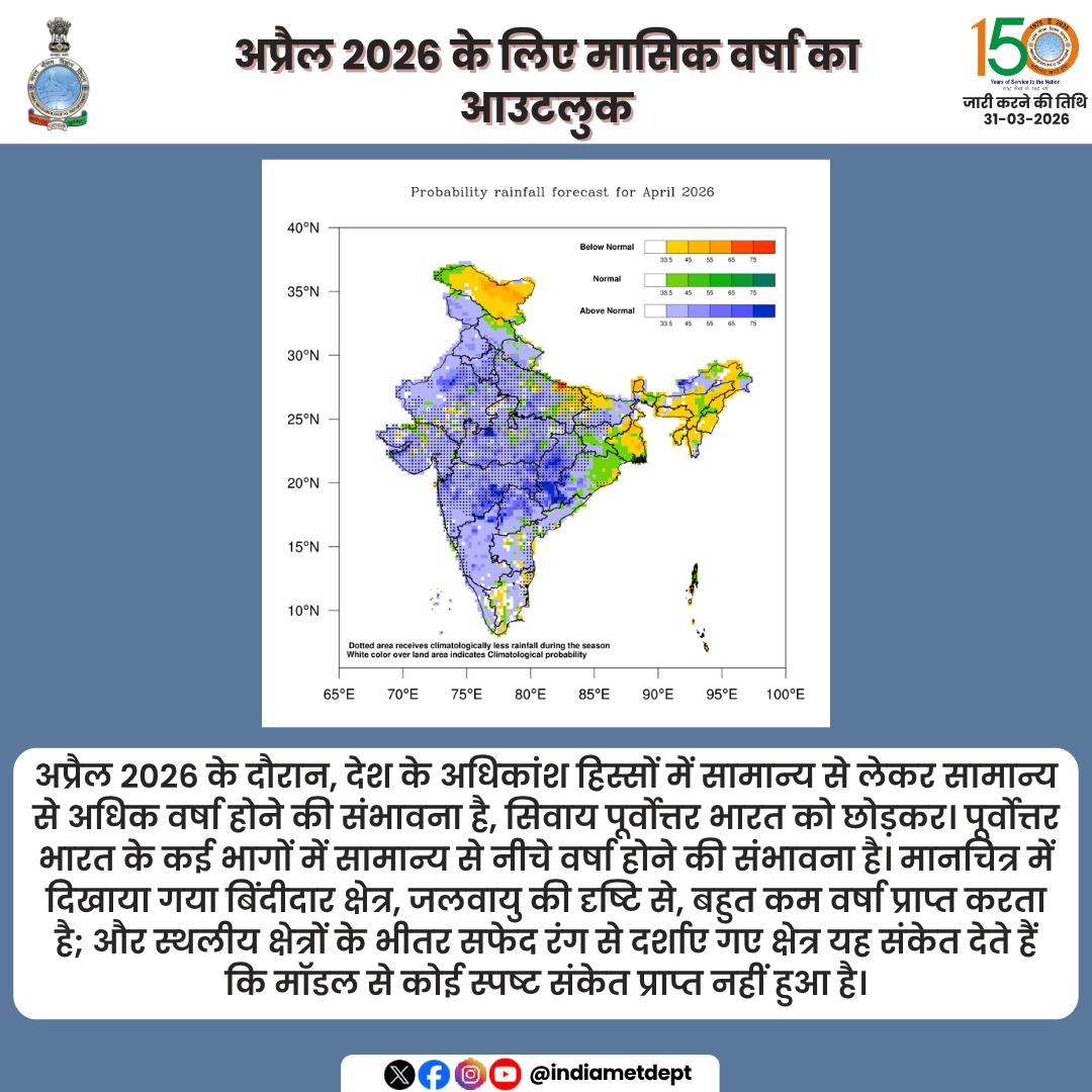 अप्रैल के महीने में सबसे ज्यादा बारिश पूर्वी भारत में होने की संभावना है। बंगाल, बिहार, झारखंड, सिक्किम और ओडिशा में 6 अप्रैल तक बारिश का दौर जारी रह सकता है। इसके अलावा पश्चिमी भारत में ज्यादातर मौसम साफ रहने की संभावना है। दक्षिण भारत में मौसम उमस भरा रहने की संभावना है। इसके साथ ही कुछ हिस्सों में छिटपुट बारिश की घटनाएं भी हो सकती हैं।