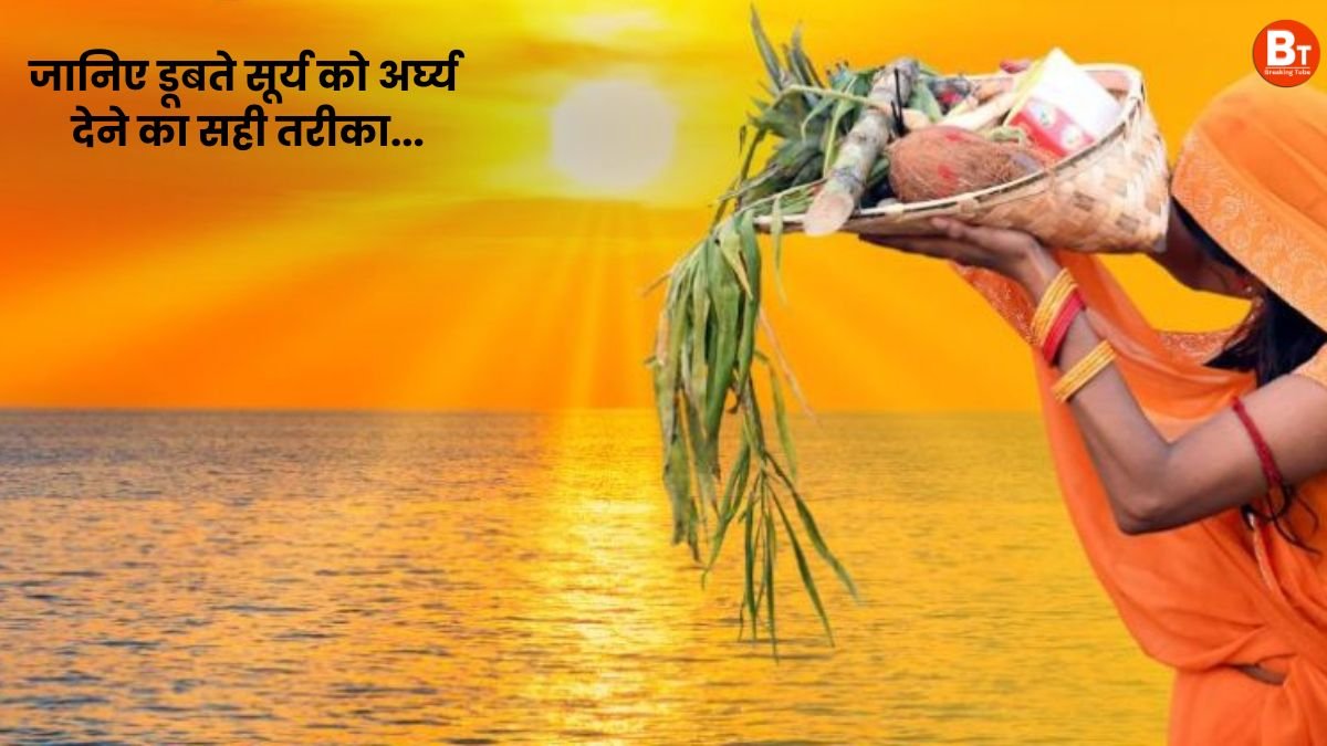 तीसरे दिन शाम को व्रती महिलाएं स्नान कर स्वच्छ वस्त्र धारण करती हैं और फल, ठेकुआ, नारियल, दीपक और गन्ना से भरे बांस की सूप में अर्घ्य की तैयारी करती हैं। इसके बाद नदी या आंगन में जल से भरे पात्र के सामने खड़े होकर सूर्य की दिशा में मुख करके मंत्र ‘ऊँ सूर्याय नमः’ का उच्चारण करते हुए अर्घ्य देती हैं। इस समय परिवार की सुख-समृद्धि और स्वास्थ्य की कामना करते हुए छठी मैय्या के भजन भी गाए जाते हैं।