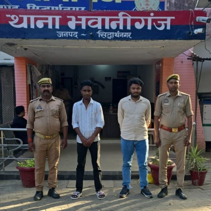 भवानीगंज पुलिस ने शांति भंग के आरोप में दो व्यक्तियों को गिरफ्तार किया है। यह कार्रवाई 31 मार्च 2026 को थानाध्यक्ष बृजेश सिंह के नेतृत्व में की गई। गिरफ्तार किए गए आरोपियों को संबंधित धाराओं के तहत माननीय न्यायालय में पेश किया गया। गिरफ्तार किए गए व्यक्तियों की पहचान आयुष पाण्डेय पुत्र ध्रुवचंद्र पाण्डेय और विशाल मौर्या पुत्र अशोक कुमार मौर्या के रूप में हुई है। दोनों बयारा, थाना भवानीगंज के निवासी हैं। उन्हें भारतीय न्याय संहिता (बीएनएसएस) की धारा 170, 126 और 135 के तहत गिरफ्तार किया गया। इस गिरफ्तारी अभियान में शामिल पुलिस टीम में उप निरीक्षक रामशब्द यादव, हेड कांस्टेबल अजय कुमार सिंह और कांस्टेबल राजमणि प्रमुख रूप से शामिल थे।
