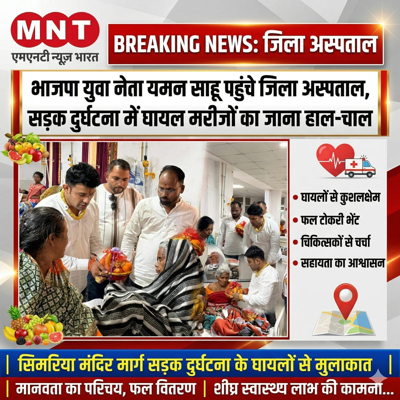 - घायलों के बीच पहुंचे युवा नेता यमन साहू, जिला अस्पताल में बांटे फल और बढ़ाया हौसला
