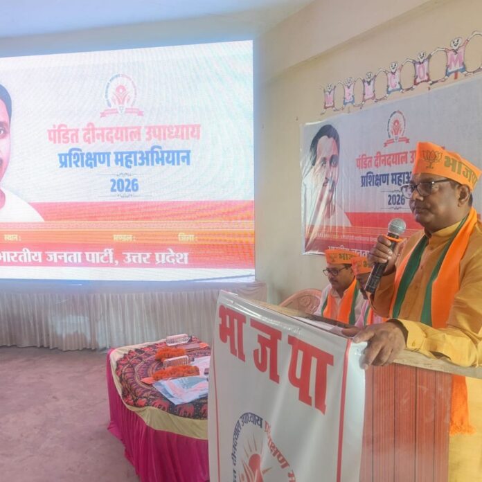 महाराजगंज जिले में भारतीय जनता पार्टी के शिकारपुर और घुघली मंडल द्वारा संयुक्त रूप से दो दिवसीय ‘पंडित दीनदयाल उपाध्याय प्रशिक्षण अभियान’ का शुभारंभ किया गया। यह कार्यक्रम घुघली क्षेत्र के बेलवा टीकर स्थित प्रभावती देवी महाविद्यालय में आयोजित हुआ। कार्यक्रम की शुरुआत पंडित दीनदयाल उपाध्याय, डॉ. श्यामा प्रसाद मुखर्जी और भारत माता के चित्रों पर पुष्प अर्पित कर तथा ‘वंदे मातरम’ के सामूहिक गायन के साथ की गई। घुघली मंडल के प्रशिक्षण सत्र में सदर विधायक जय मंगल कन्नौजिया ने ‘सरकार की उपलब्धियां’ विषय पर अपने विचार रखते हुए केंद्र और प्रदेश सरकार की विभिन्न योजनाओं का उल्लेख किया। उन्होंने कहा कि सरकार समाज के हर वर्ग के उत्थान के लिए निरंतर कार्य कर रही है।