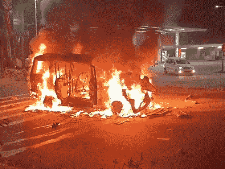 बस्ती में डीसीएम से टकराकर बोलेरो बनी आग का गोला:दो झुलसे, पांच यात्रियों की बची जान