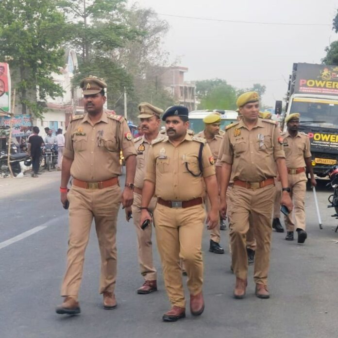 शोहरतगढ़ में सीओ ने पुलिस के साथ किया फ्लैग मार्च:कानून-व्यवस्था मजबूत रखने के लिए सुरक्षा व्यवस्था का लिया जायजा
