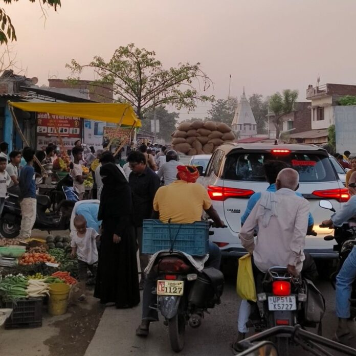 लालगंज बाजार में दुकानदारों के अतिक्रमण से भीषण जाम:विधायक की भी गाड़ी फंसी, थानाध्यक्ष ने कार्रवाई का आश्वासन दिया