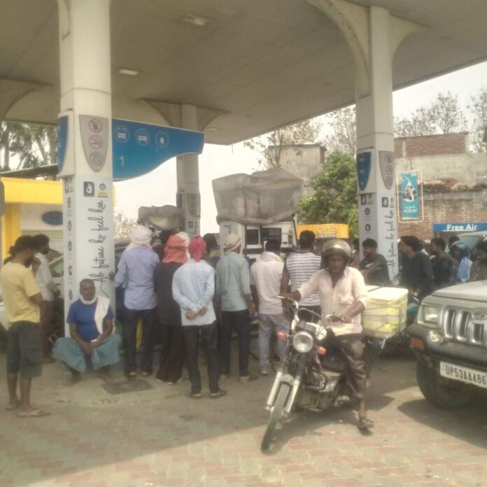 निचलौल में पेट्रोल पंपों पर डीजल-पेट्रोल की किल्लत:लोग लंबी लाइन लगाने के मजबूर, गन्ने की खेत सूखने की कगार पर