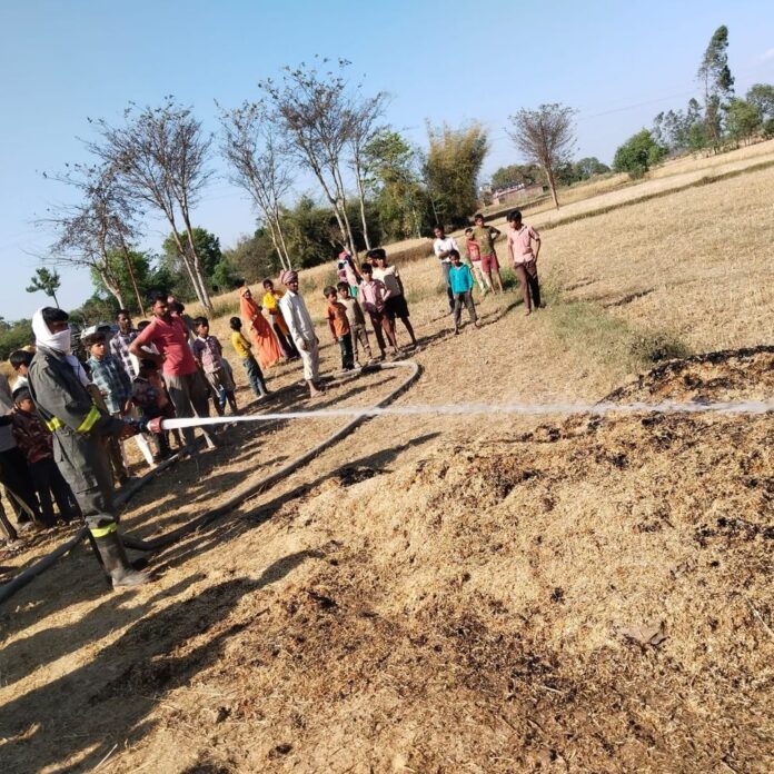 इकौना में भूसे में लगी आग:गेहूं मड़ाई के दौरान मची अफरा-तफरी, फायर ब्रिगेड ने बुझाई