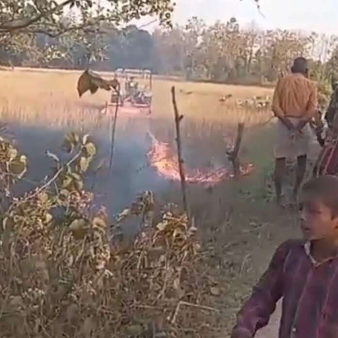 श्रावस्ती में गन्ने के खेत में आग:10 बीघा फसल जलकर राख, भारी नुकसान से किसान परेशान
