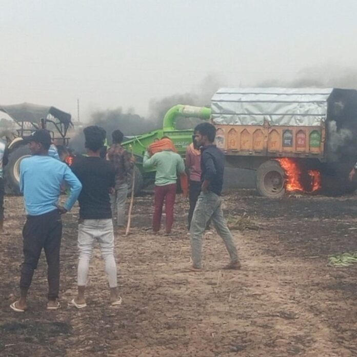 भूसा मशीन से निकली चिंगारी से लगी आग:फरेंदा में ट्रैक्टर, मशीन और गेहूं की फसल जलकर राख, किसानों को भारी नुकसान