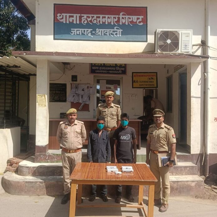 श्रावस्ती। हरदत्तनगर गिरण्ट पुलिस ने एक माह पूर्व हुई चोरी की घटना का पर्दाफाश करते हुए दो आरोपियों को गिरफ्तार किया है। पुलिस ने उनके कब्जे से चोरी का सामान भी बरामद किया है। यह कार्रवाई जनपद में अपराध नियंत्रण अभियान के तहत की गई। पुलिस अधीक्षक राहुल भाटी के निर्देश पर अपर पुलिस अधीक्षक मुकेश चन्द्र उत्तम और क्षेत्राधिकारी भिनगा भरत पासवान के पर्यवेक्षण में यह कार्रवाई की गई। प्रभारी निरीक्षक महिमानाथ उपाध्याय के नेतृत्व में गठित टीम इस मामले की जांच कर रही थी। बीते 07 मार्च 2026 को जयपत्तरपुरवा निवासी धर्मराज यादव ने हरदत्तनगर गिरण्ट थाने में शिकायत दर्ज कराई थी। उन्होंने बताया था कि अज्ञात चोर उनके घर से जेवर और नकदी चोरी कर ले गए थे। पुलिस ने शिकायत के आधार पर मुकदमा दर्ज कर जांच शुरू की। घटना स्थल का निरीक्षण, साक्ष्य संकलन और संदिग्धों की तलाश के बाद पुलिस को 12 अप्रैल को सफलता मिली। मुखबिर की सूचना पर सुजानडीह जंगल के पास से दो अभियुक्तों को गिरफ्तार किया गया। गिरफ्तार आरोपियों के कब्जे से पुलिस ने 02 अदद बिछिया (सफेद धातु), 02 मोबाइल फोन और ₹4000 नकद बरामद किए हैं। गिरफ्तार किए गए अभियुक्तों की पहचान कासिम उर्फ कनऊ उर्फ राजू पुत्र रहीस, निवासी कलंदरी पुरवा और शिव कुमार उर्फ शिवा पुत्र कन्हई, निवासी बहोरवा के रूप में हुई है। अभियुक्त कासिम उर्फ राजू का आपराधिक इतिहास रहा है। उसके खिलाफ एनडीपीएस एक्ट, चोरी और आयुध अधिनियम सहित कई मुकदमे दर्ज हैं। शिव कुमार के विरुद्ध भी पूर्व में आपराधिक मामला पंजीकृत है।
