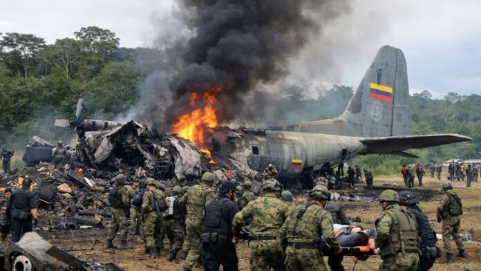 कोलंबिया के दक्षिणी हिस्से में पेरू की सीमा के पास एक बड़ा दुर्घटना हुई है। कोलंबियाई वायु सेना का एक हर्क्यूलिस विमान क्रैश हो गया। यह विमान सैनिकों को ले जा रहा था।