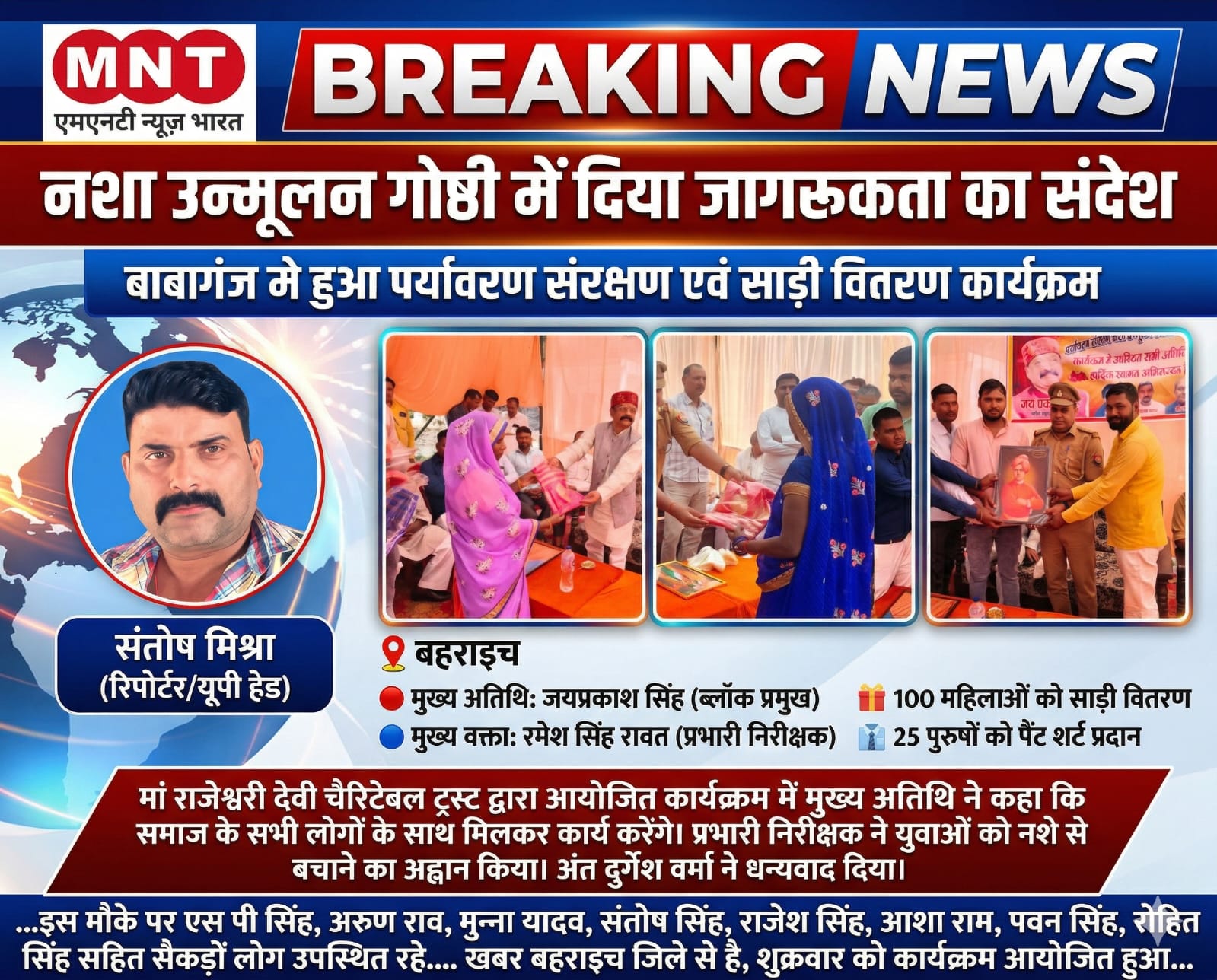 नशा उन्मूलन गोष्ठी में दिया जागरूकता का संदेश, बाबागंज मे हुआ पर्यावरण संरक्षण एवं साड़ी वितरण कार्यक्रम