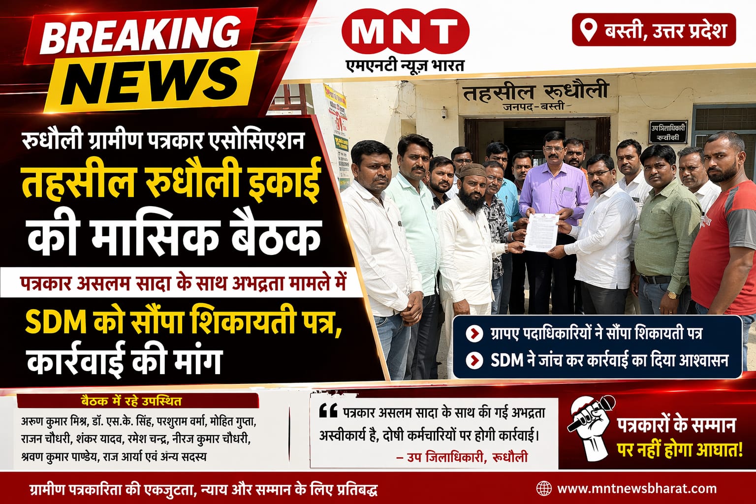 रूधौली, बस्ती। उत्तर प्रदेश ग्रामीण पत्रकार एसोसिएशन, तहसील इकाई रूधौली की मासिक बैठक गुरुवार को दोपहर 1:30 बजे रूधौली तहसील परिसर में आयोजित की गई। बैठक का मुख्य मुद्दा संगठन के पत्रकार मोहम्मद असलम सादा के साथ गैस एजेंसी वितरक कर्मचारियों द्वारा की गई अभद्रता के मामले में न्याय दिलाने हेतु सक्षम अधिकारी को शिकायती पत्र सौंपकर कार्रवाई की मांग करना रहा।