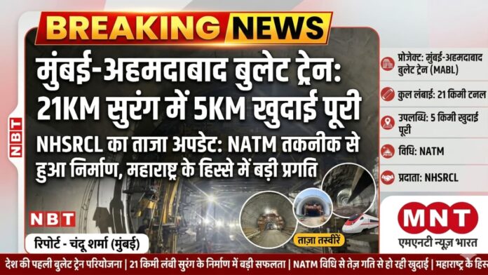 मुंबई: देश के पहले बुलेट ट्रेन कॉरिडोर का काम तेजी से आगे बढ़ रहा है। नेशनल हाईस्पीड रेल कॉरपोरेशन लिमिटेड (NHSRCL) ने मुंबई-अहमदाबाद बुलेट ट्रेन प्रोजेक्ट में बनाई जा रही 21 किमी लंबी सुरंग का अपडेट साझा किया है। एनएचएसआरसीएल ने बताया है कि इस सुरंग के पांच किलोमीटर हिस्से की खुदाई न्यू ऑस्ट्रियन टनलिंग मेथड (NATM) के माध्यम से पूरी कर ली गई है। एनएचएसआरसीएल ने ताजा तस्वीरें भी रिलीज की हैं। एक आधिकारिक बयान में कहा गया है कि खुदाई पूरी होने के साथ ही अब सुरंग निर्माण के अगले चरणों में कार्य प्रगति पर है।