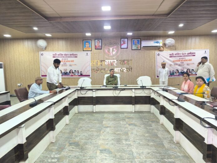 श्रावस्ती,। आज नारी शक्ति वंदन सम्मेलन का देश के मा0 प्रधानमन्त्री जी द्वारा शुभारंभ किया गया। इस दौरान उन्होंने ऑनलाइन माध्यम से देशभर की महिलाओं को सम्बोधन में, विभिन्न कार्यक्षेत्रों सं जुड़ी महिलाओं के साथ संवाद, पंचायत से पार्लियामेन्ट तक महिलाओं की सशक्त भागीदारी सुनिश्चित करने का संकल्प का समबोधन कार्यक्रम किया। उक्त कार्यक्रम के तहत जनपद के कलेक्टर सभागार में जिलाधिकारी अश्विनी कुमार पाण्डेय की अध्यक्षता में कार्यक्रम का आयोजन किया गया। तथा मा0 प्रधानमंत्री जी के सम्बोधन को भी सुना गया।
