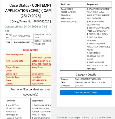 उक्त अवमानना याचिका पर दिनांक 29 अप्रैल 2026 को उच्च न्यायालय, इलाहाबाद की कोर्ट संख्या-9 में सुनवाई निर्धारित की गई है, जिसमें वादी आशुतोष ब्रह्मचारी महाराज स्वयं (In Person) उपस्थित होकर अपनी पैरवी करेंगे।
