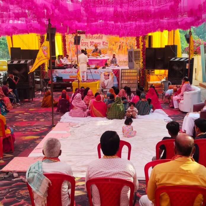 बृजमनगंज में भागवत कथा का दूसरा दिन:यज्ञाचार्य योगेंद्र कृष्ण शास्त्री ने श्रद्धालुओं को गीता पाठ सुनाया