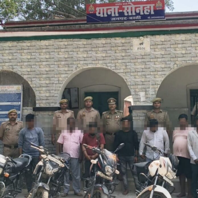 बस्ती। सोनहा थाना पुलिस ने सार्वजनिक स्थान पर जुआ खेल रहे नौ लोगों को गिरफ्तार किया है। यह कार्रवाई 19 अप्रैल 2026 को ग्राम असनहरा स्थित एक आम के बाग में की गई। पुलिस ने मौके से लाखों रुपये का सामान और नकदी भी बरामद की है। पुलिस को मुखबिर से सूचना मिली थी कि असनहरा गांव के आम के बाग में कुछ लोग जुआ खेल रहे हैं। सूचना के आधार पर पुलिस टीम ने शाम करीब 4:45 बजे मौके पर छापा मारा। छापेमारी के दौरान आरोपी हार-जीत की बाजी लगाकर जुआ खेलते हुए पाए गए। पुलिस ने जुआरियों के पास से 45,580 रुपये नकद, 52 ताश के पत्ते, 8 मोबाइल फोन और 13 मोटरसाइकिलें बरामद की हैं। गिरफ्तारी के बाद, सोनहा थाने में सभी आरोपियों के खिलाफ मु0अ0सं0 80/2026 धारा 13 सार्वजनिक जुआ अधिनियम के तहत मुकदमा दर्ज किया गया है। बरामद सभी मोटरसाइकिलों को मोटर व्हीकल एक्ट के तहत सीज कर दिया गया है। गिरफ्तार किए गए अभियुक्तों की पहचान अब्दुल कयूम, महेंद्र प्रसाद, वीरेंद्र कुमार, सत्य प्रकाश, विकास यादव, अंगद चौहान, श्यामलाल, विकास अग्रहरि और राजू गुप्ता के रूप में हुई है। पुलिस इस मामले में आगे की कानूनी कार्रवाई कर रही है।