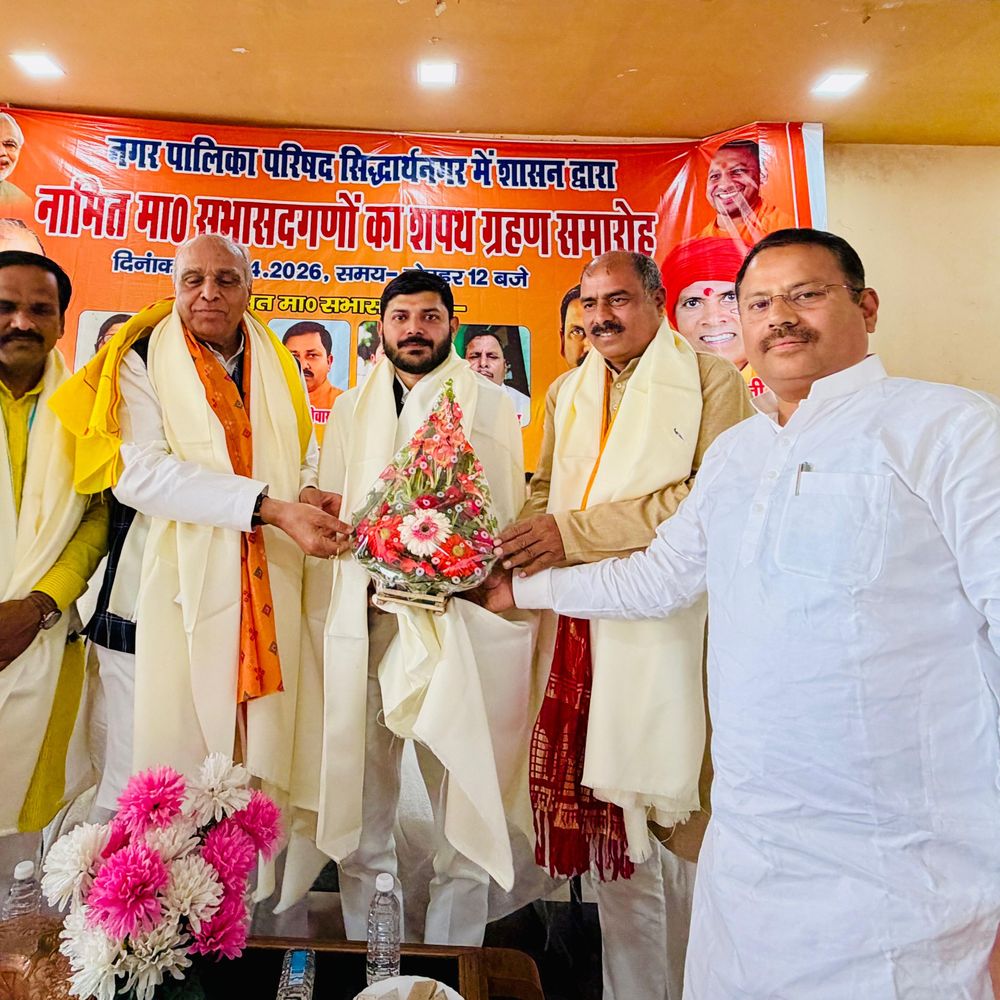 सिद्धार्थनगर नगर पालिका परिषद में शासन द्वारा नामित सभासदों का शपथ ग्रहण समारोह 3 अप्रैल शुक्रवार को आयोजित किया गया। इस अवसर पर जनप्रतिनिधि, प्रशासनिक अधिकारी और बड़ी संख्या में कार्यकर्ता उपस्थित रहे। समारोह में डुमरियागंज सांसद जगदंबिका पाल, भाजपा जिलाध्यक्ष दीपक मौर्य, हरिचरण कुशवाहा, नगर पालिका परिषद अध्यक्ष गोविंद माधव, विधायक कपिलवस्तु प्रतिनिधि सत्यप्रकाश राही, उपजिलाधिकारी नौगढ़ कल्याण सिंह मौर्य सहित कई गणमान्य व्यक्ति मौजूद थे। सभी अतिथियों ने नव-नामित सभासदों को बधाई दी और उनसे जनहित को प्राथमिकता देते हुए कार्य करने का आग्रह किया। पूनम मित्तल, राजेश जायसवाल, बबलू श्रीवास्तव, भानु सिसोदिया और महेश प्रसाद उन प्रमुख सभासदों में शामिल थे। जिन्होंने शपथ ली। इन सभी ने पद और गोपनीयता की शपथ लेते हुए नगर के विकास, स्वच्छता व्यवस्था को सुदृढ़ करने, सुशासन को बढ़ावा देने और नागरिकों को बेहतर सुविधाएं प्रदान करने का संकल्प लिया। नव-शपथ ग्रहण करने वाले सभासदों को बधाई दी कार्यक्रम के दौरान वक्ताओं ने नगर पालिका परिषद की महत्वपूर्ण भूमिका पर प्रकाश डाला। उन्होंने बताया कि स्थानीय निकाय जनता के सबसे करीब होते हैं। इनके माध्यम से आम लोगों की समस्याओं का त्वरित समाधान संभव है। वक्ताओं ने सभासदों से योजनाओं को लागू करने के साथ-साथ जनता की अपेक्षाओं पर खरा उतरने और अपने दायित्वों का निर्वहन ईमानदारी, पारदर्शिता तथा संवेदनशीलता के साथ करने की अपेक्षा की। उपस्थित गणमान्य व्यक्तियों ने सभी नव-शपथ ग्रहण करने वाले सभासदों को बधाई दी। उन्होंने विश्वास व्यक्त किया कि सभी सदस्य मिलकर नगर को स्वच्छ, सुंदर और विकसित बनाने में महत्वपूर्ण भूमिका निभाएंगे और शासन की मंशा के अनुरूप विकास कार्यों को गति प्रदान करेंगे। कार्यक्रम के दौरान पूरे परिसर में उत्सव जैसा माहौल देखने को मिला। उपस्थित लोगों ने तालियों की गड़गड़ाहट के साथ नव-नियुक्त सभासदों का स्वागत किया और उनके सफल कार्यकाल की कामना की। अंत में सभी नवनियुक्त सभासदों को हार्दिक बधाई देते हुए उनके प्रभावी, जनसेवा से परिपूर्ण और उपलब्धियों से भरे कार्यकाल की शुभकामनाएं दी गईं।