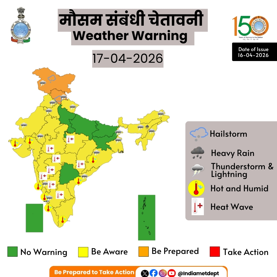 देशभर में गर्मी का सितम बढ़ने वाला है। मौसम विभाग ने आज यानी 17 अप्रैल को कई राज्यों में लू का अलर्ट जारी कर दिया है। कल और आज के तापमान में कई राज्यों में 2-3 डिग्री की बढ़ोतरी हुई है। मौसम विभाग का अनुमान है कि यह बढ़ोतरी आज भी जारी रह सकती है। इसके साथ ही कुछ राज्यों में तूफान का अलर्ट भी जारी किया गया है और कुछ राज्यों में बारिश होने की भी संभावना है। मौसम विभाग के अनुसार, जिन राज्यों में बारिश होने की संभावना है उनमें दिल्ली, बिहार, हिमाचल, राजस्थान, चंडीगढ़, उत्तराखंड, अरुणाचल प्रदेश, मिजोरम समेत कुल 13 राज्य शामिल हैं।