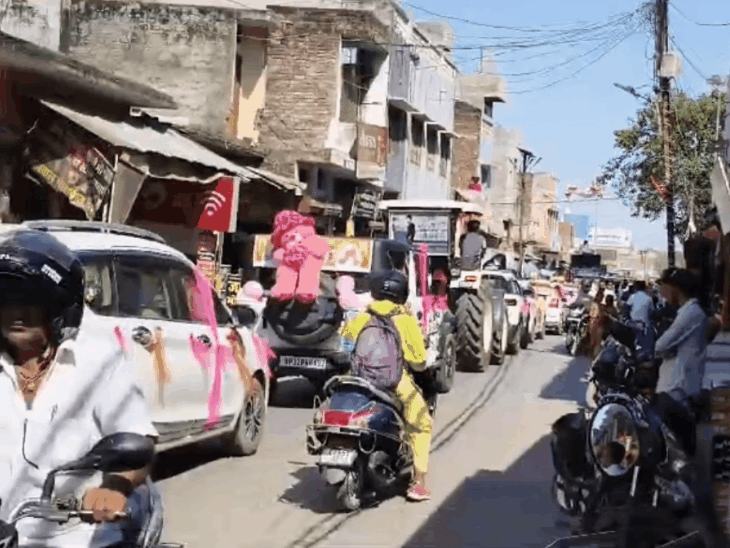 बृजमनगंज में बेटी के जन्म पर दंपति ने मनाया जश्न:गाजे-बाजे के साथ सजी गाड़ियों में नवजात को घर ले गए