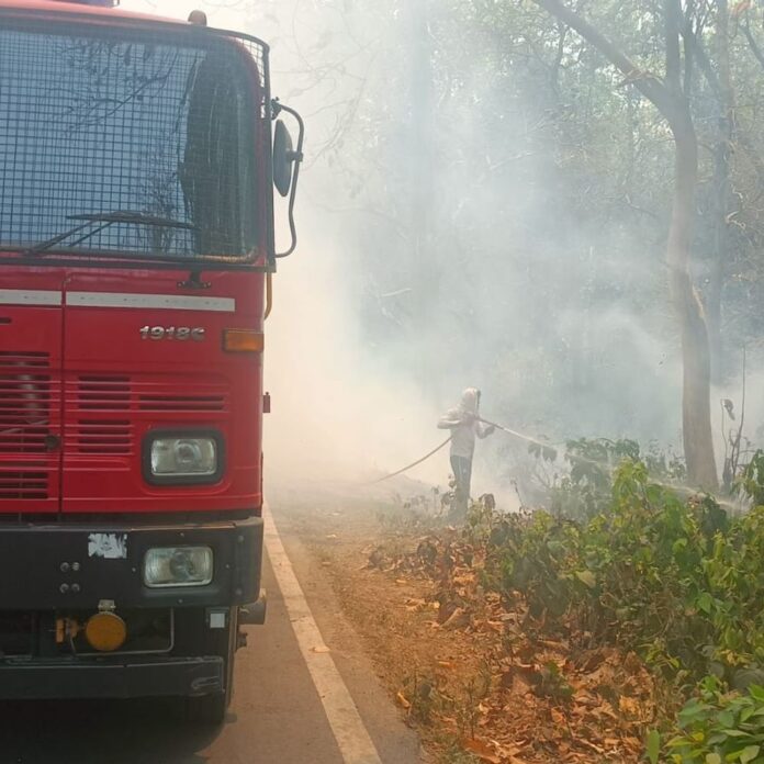 महराजगंज के फरेंदा जंगल में आग:लेहड़ा मंदिर मार्ग के पास लगी, फायर ब्रिगेड ने बुझाई