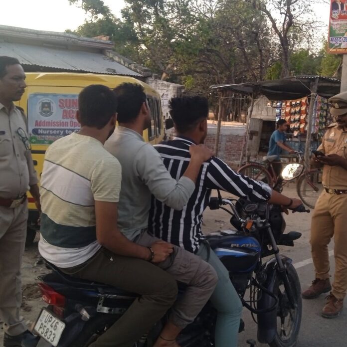 श्रावस्ती में हिताई नगर मोड़ पर वाहन चेकिंग अभियान:चौकी प्रभारी ने तीन सवारी, बिना हेलमेट वालों पर की कार्रवाई