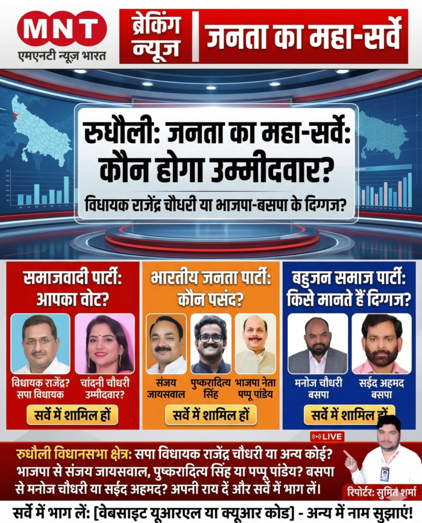 रुधौली विधानसभा क्षेत्र में राजनीतिक हलचल तेज हो गई है, क्योंकि प्रमुख राजनीतिक दल आगामी चुनावों के लिए अपने उम्मीदवारों को अंतिम रूप देने में लगे हैं। इसी क्रम में, ‘एमएनटी न्यूज़ भारत’ जनता की नब्ज टटोलने के लिए एक विशेष ‘महा-सर्वे’ लेकर आया है, जिसका उद्देश्य यह जानना है कि रुधौली की जनता किस नेता को अपना उम्मीदवार बनते देखना चाहती है।