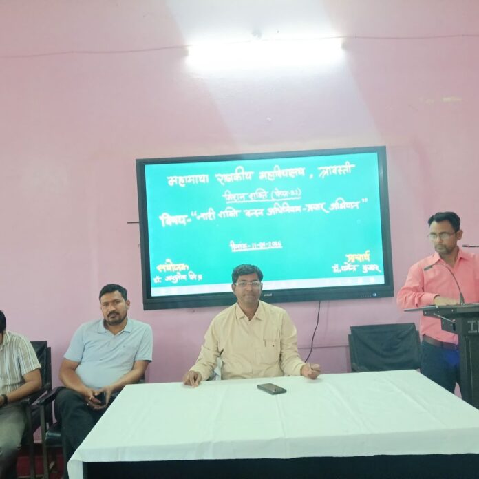 श्रावस्ती। शासन एवं उच्च शिक्षा विभाग, उत्तर प्रदेश के निर्देशानुसार ‘मिशन शक्ति’ पंचम चरण के द्वितीय भाग के तहत शनिवार, 11 अप्रैल 2026 को महामाया राजकीय महाविद्यालय, श्रावस्ती में एक महिला जागरूकता कार्यक्रम आयोजित किया गया। इस कार्यक्रम में ‘नारी शक्ति वंदन अधिनियम-2023’ पर गहन विचार-विमर्श हुआ। कार्यक्रम की अध्यक्षता महाविद्यालय के प्राचार्य डॉ. धर्मेन्द्र गुप्त ने की। संगोष्ठी का मुख्य विषय ‘नारी शक्ति वंदन अधिनियम-2023 का प्रचार-प्रसार’ था। अपने संबोधन में प्राचार्य डॉ. गुप्त ने कहा कि संसद द्वारा पारित यह अधिनियम महिलाओं के वास्तविक सशक्तिकरण की दिशा में एक महत्वपूर्ण कदम है। उन्होंने जोर दिया कि जब देश और राज्यों की विधायिकाओं में अधिक संख्या में महिलाएं निर्वाचित होकर पहुंचेंगी, तो हमारा लोकतंत्र और अधिक सशक्त एवं सक्षम बनेगा। कार्यक्रम का संचालन एवं संयोजन डॉ. आशुतोष मिश्र द्वारा किया गया। इस अवसर पर डॉ. उपेन्द्र कुमार सोनी और डॉ. सत्य प्रकाश वर्मा भी उपस्थित रहे। संगोष्ठी में 60 से अधिक छात्र-छात्राओं ने भाग लिया। उन्होंने महिला सशक्तिकरण से जुड़े विभिन्न पहलुओं पर अपने विचार प्रस्तुत किए। इस कार्यक्रम का मुख्य उद्देश्य छात्र-छात्राओं में जागरूकता बढ़ाना और समाज में महिलाओं की भागीदारी को प्रोत्साहित करना था।